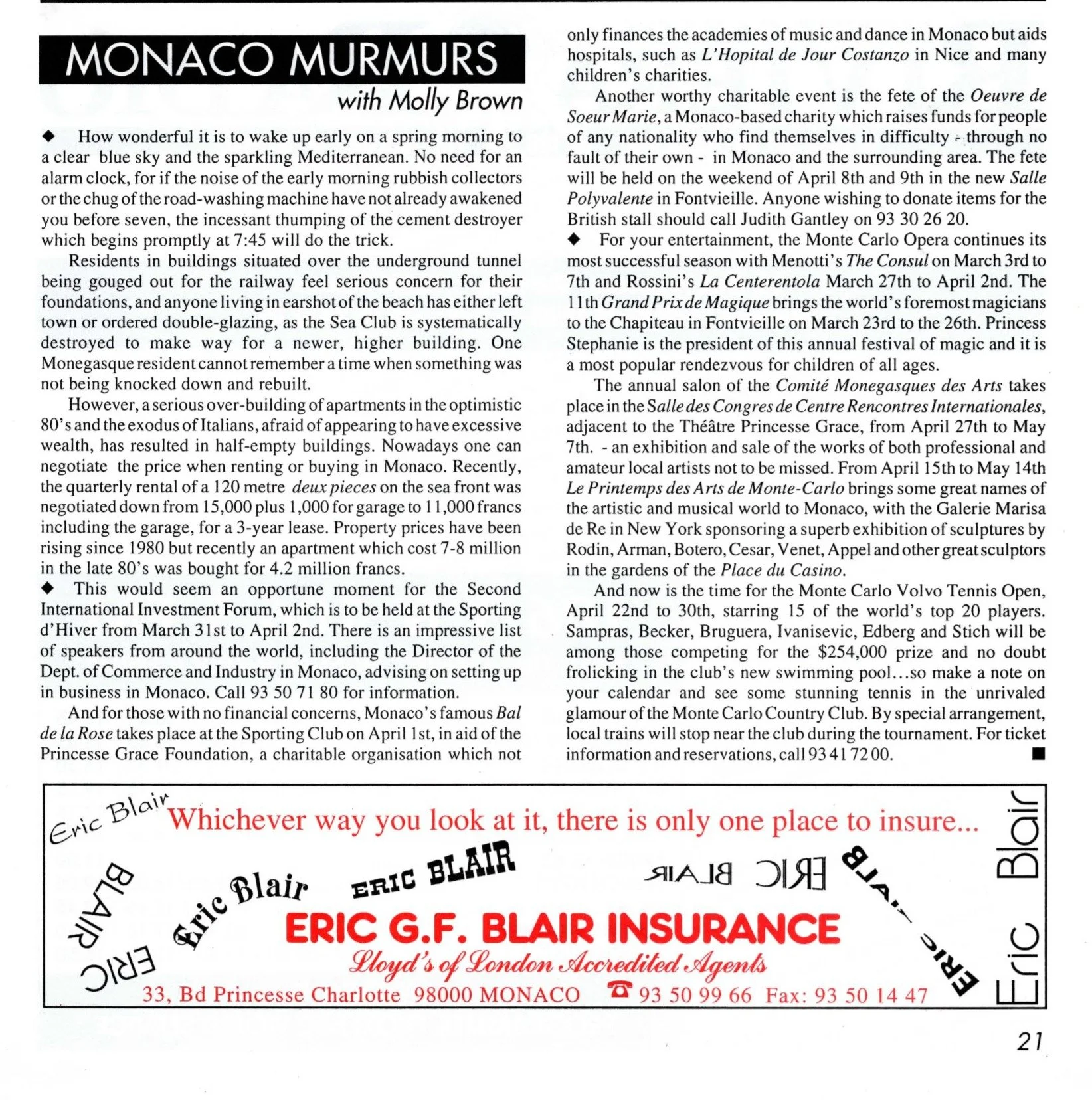 How wonderful it is to wake up early on a spring morning to a clear blue sky and the sparkling Mediterranean. No need for an alarm clock, for if the noise of the early morning rubbish collectors or the chug of the road-washing machine have not already awakened you before seven, the incessant thumping of the cement destroyer which begins promptly at 7:45 will do the trick. …