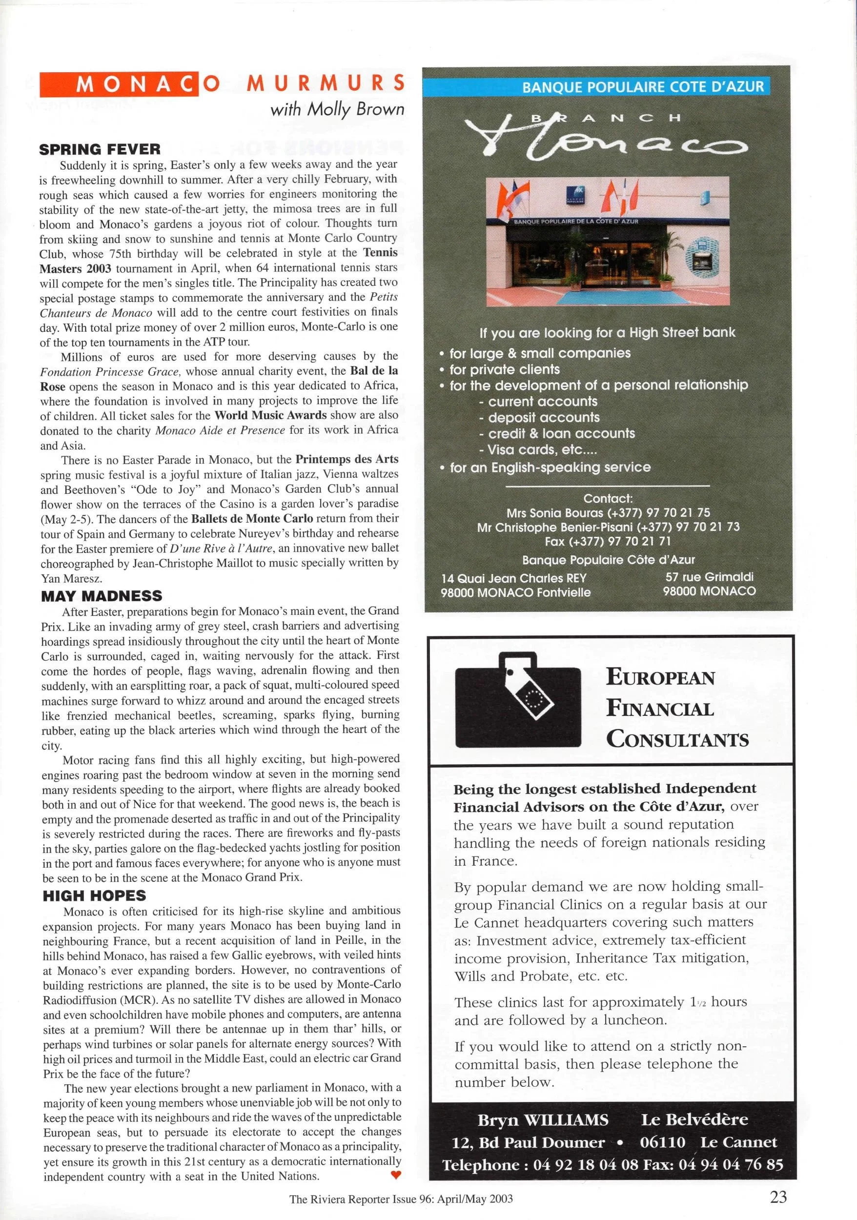 Suddenly it is spring, Easter’s only a few weeks away and the year is freewheeling downhill to summer. After a very chilly February, with rough seas which caused a few worries for engineers monitoring the stability of the new state-of-the-art jetty, the mimosa trees are in full bloom and Monaco’s gardens a joyous riot of colour. …