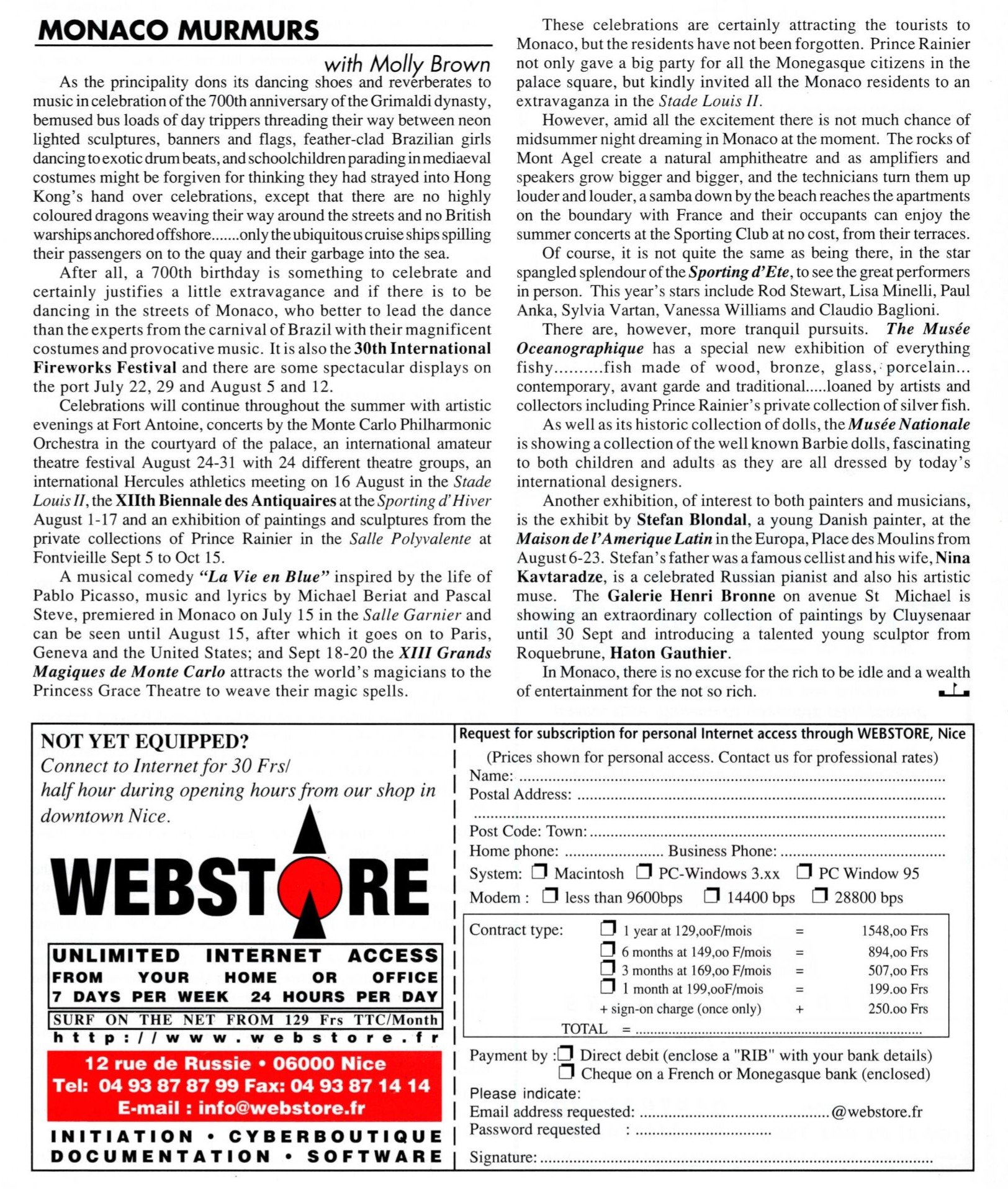 As the principality dons its dancing shoes and reverberates to music in celebration of the 700th anniversary of the Grimaldi dynasty, bemused bus loads of day trippers threading their way between neon lighted sculptures, banners and flags, feather-clad Brazilian girls dancing to exotic drum beats …