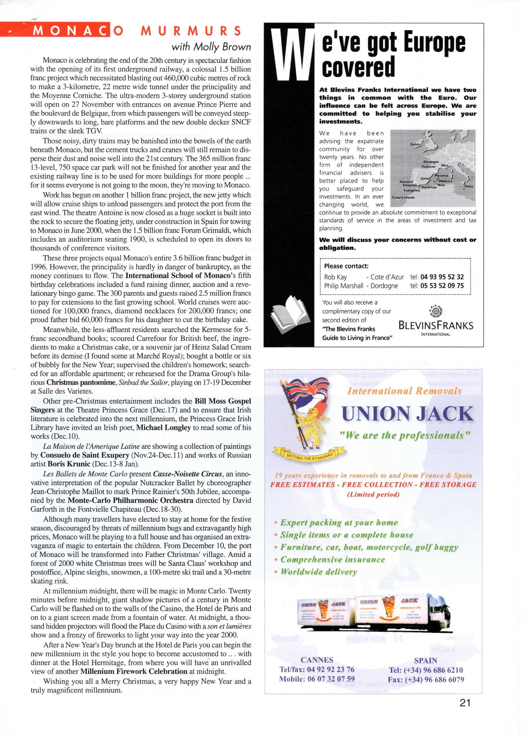 Monaco is celebrating the end of the 20th century in spectacular fashion with the opening of its first underground railway, a colossal 1.5 billion franc project which necessitated blasting out 460,000 cubic metres of rock to make a 3-kilometre, 22 metre wide tunnel under the principality and the Moyenne Corniche. The ultra-modern 3-storey underground station will open on 27 November …