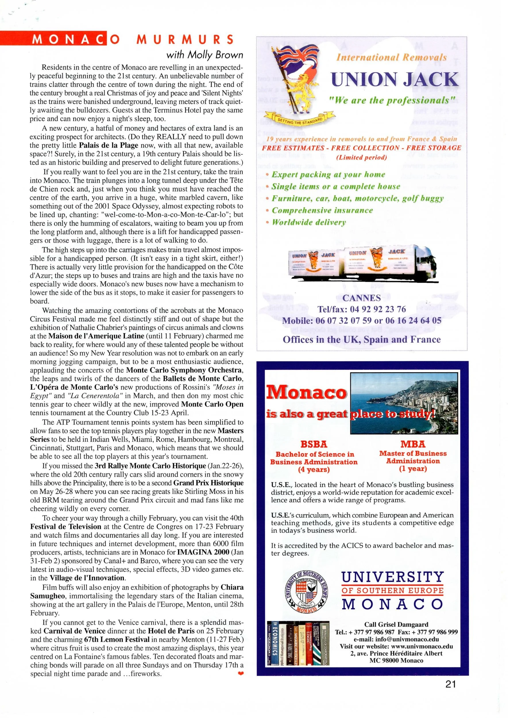 Residents in the centre of Monaco are revelling in an unexpectedly peaceful beginning to the 21st century. An unbelievable number of trains clatter through the centre of town during the night. The end of the century brought a real Christmas of joy and peace and ‘Silent Nights’ as the trains were banished underground, leaving meters of track quietly awaiting the bulldozers. Guests at the Terminus Hotel pay the same price and can now enjoy a night’s sleep, too.