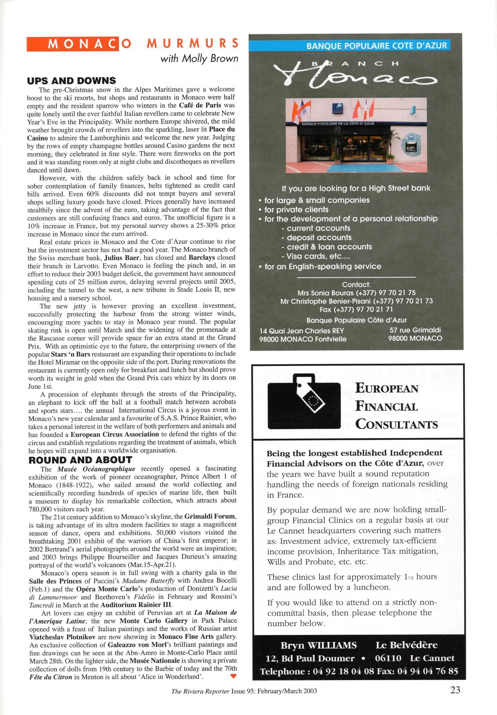 The pre-Christmas snow in the Alpes Maritimes gave a welcome boost to the ski resorts, but shops and restaurants in Monaco were half empty and the resident sparrow who winters in the Café de Paris was quite lonely until the ever faithful Italian revellers came to celebrate New Year’s Eve in the Principality. While northern Europe shivered, the mild weather brought crowds of revellers into the sparkling, laser lit Place du Casino to admire the Lamborghinis and welcome the new year. …