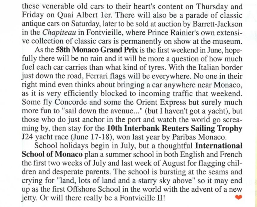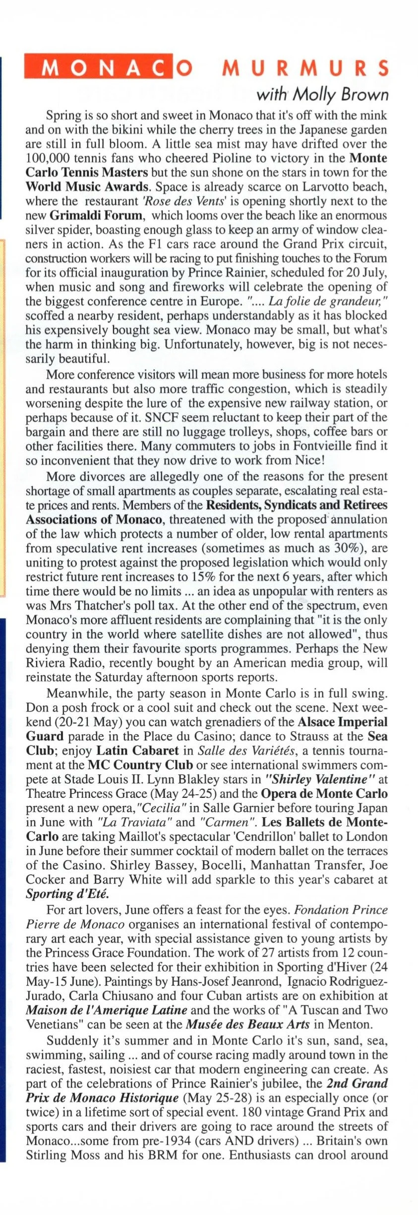 Spring is so short and sweet in Monaco that it’s off with the mink and on with the bikini while the cherry trees in the Japanese garden are still in full bloom. A little sea mist may have drifted over the 100,000 tennis fans who cheered Pioline to victory in the Monte Carlo Tennis Masters but the sun shone on the stars in town for the World Music Awards.