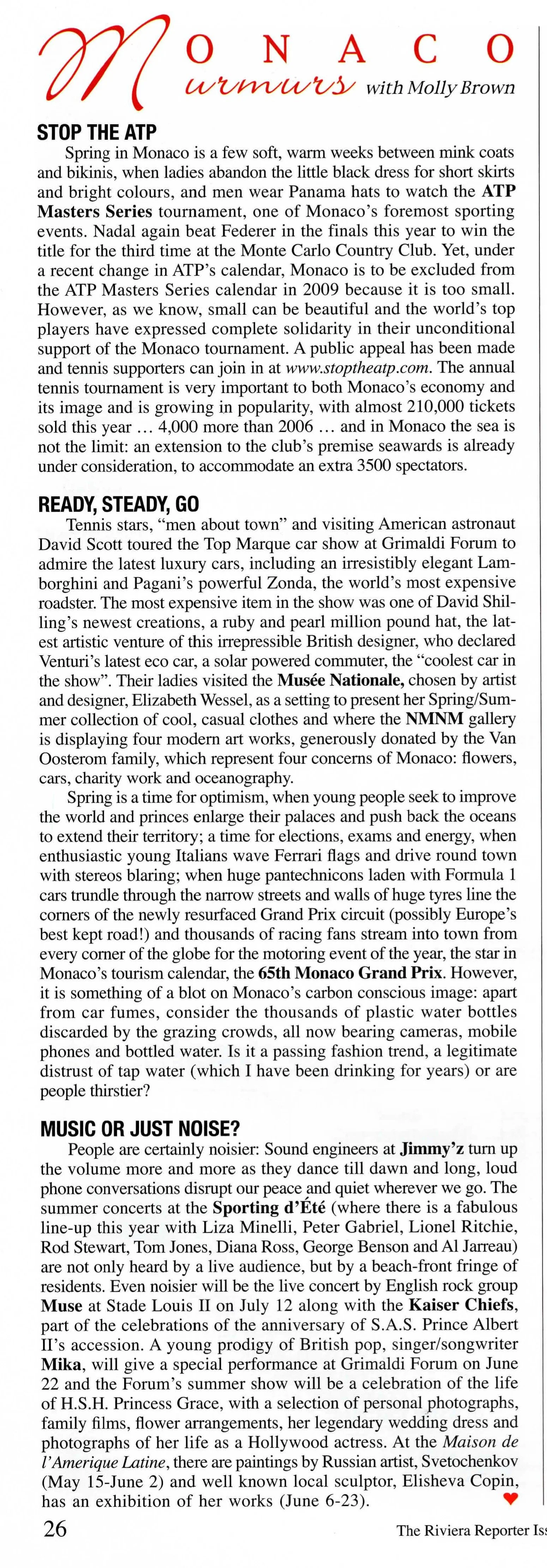 Spring in Monaco is a few soft, warm weeks between mink coats and bikinis, when ladies abandon the little black dress for short skirts and bright colours, and men wear Panama hats to watch the ATP Masters Series tournament, one of Monaco’s foremost sporting events. …