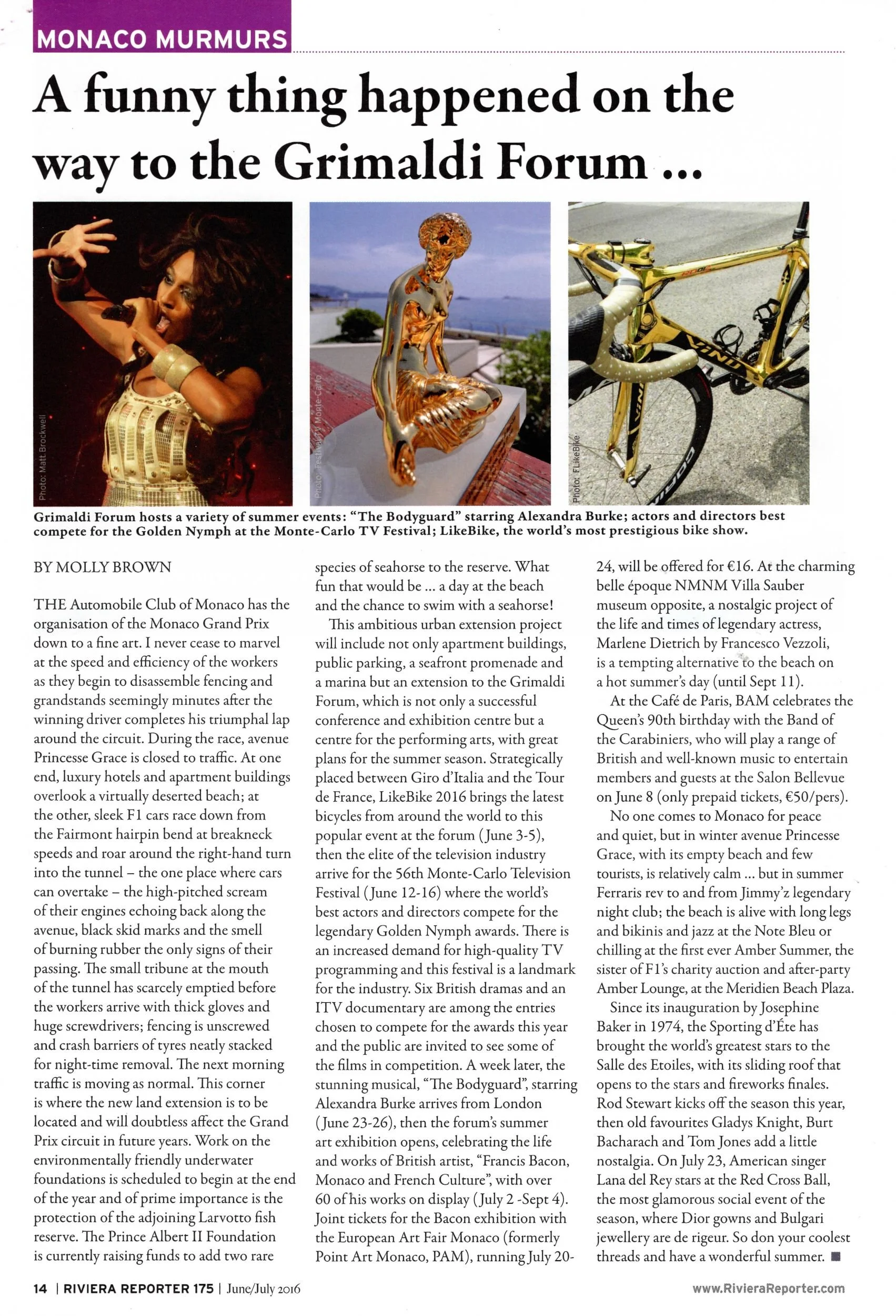 Grimaldi Forum hosts a variety of summer events: "The Bodyguard" starring Alexandra Burke; actors and directors best compete for the Golden Nymph at the Monte-Carlo TV Festival; LikeBike, the world's most prestigious bike show.